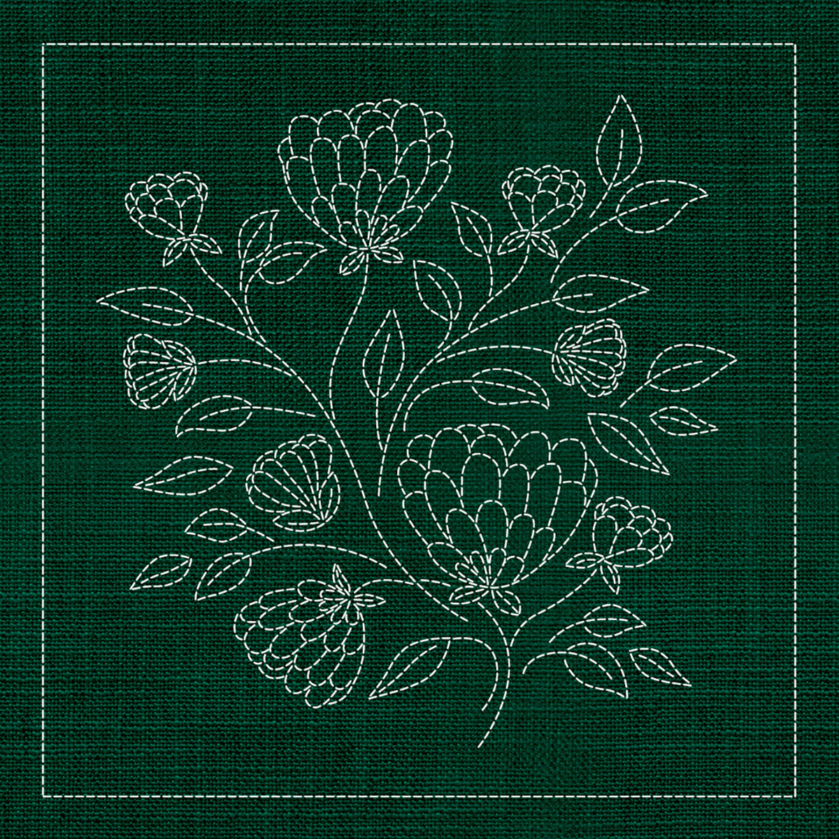 Sashiko Panel featuring a design of chrysanthemum wildflowers. The sashiko embroidery design is pre-printed on 100% Japanese cotton fabric, and will wash away after stitching.